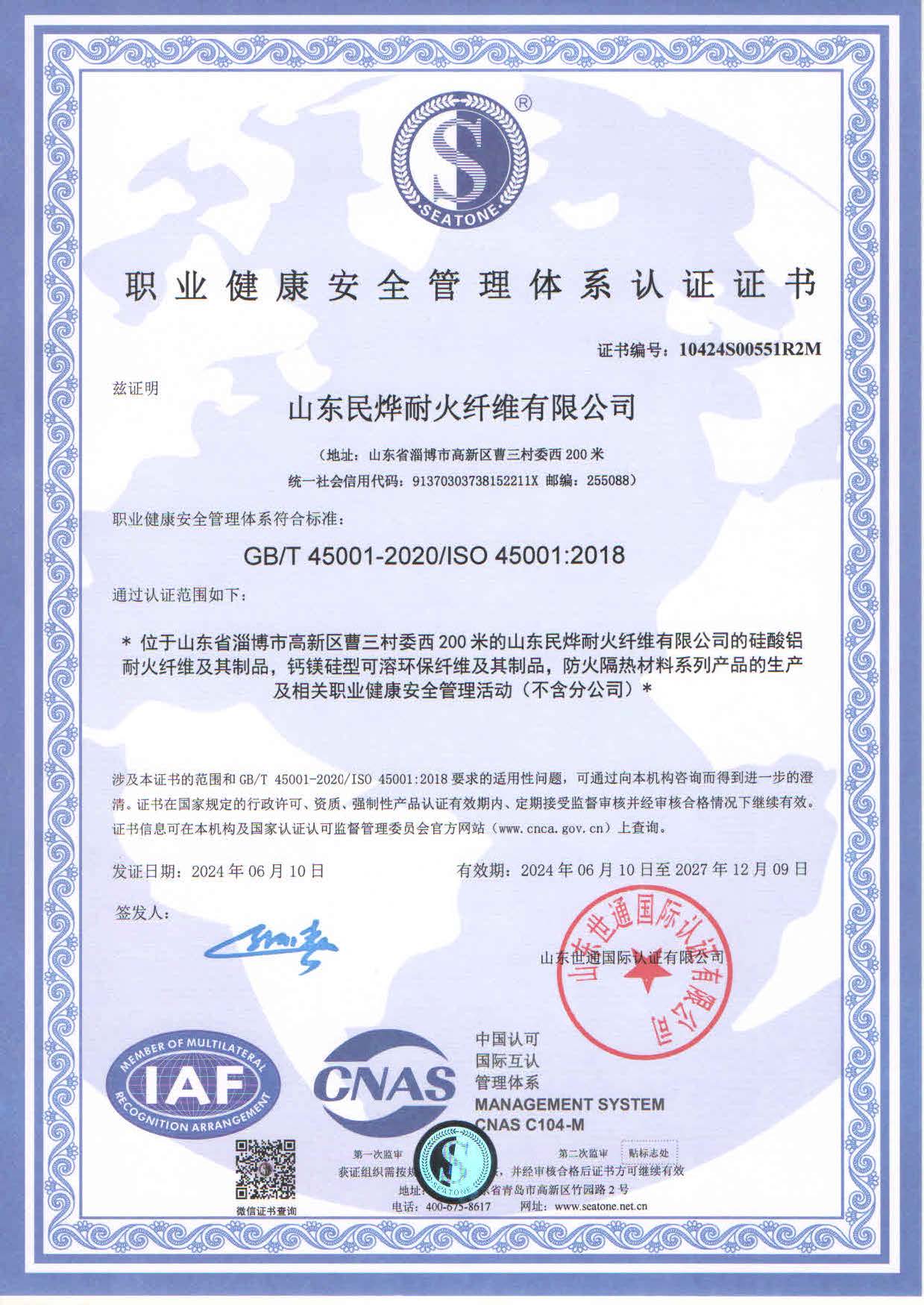 • 職業健康安全管理體系認證證書